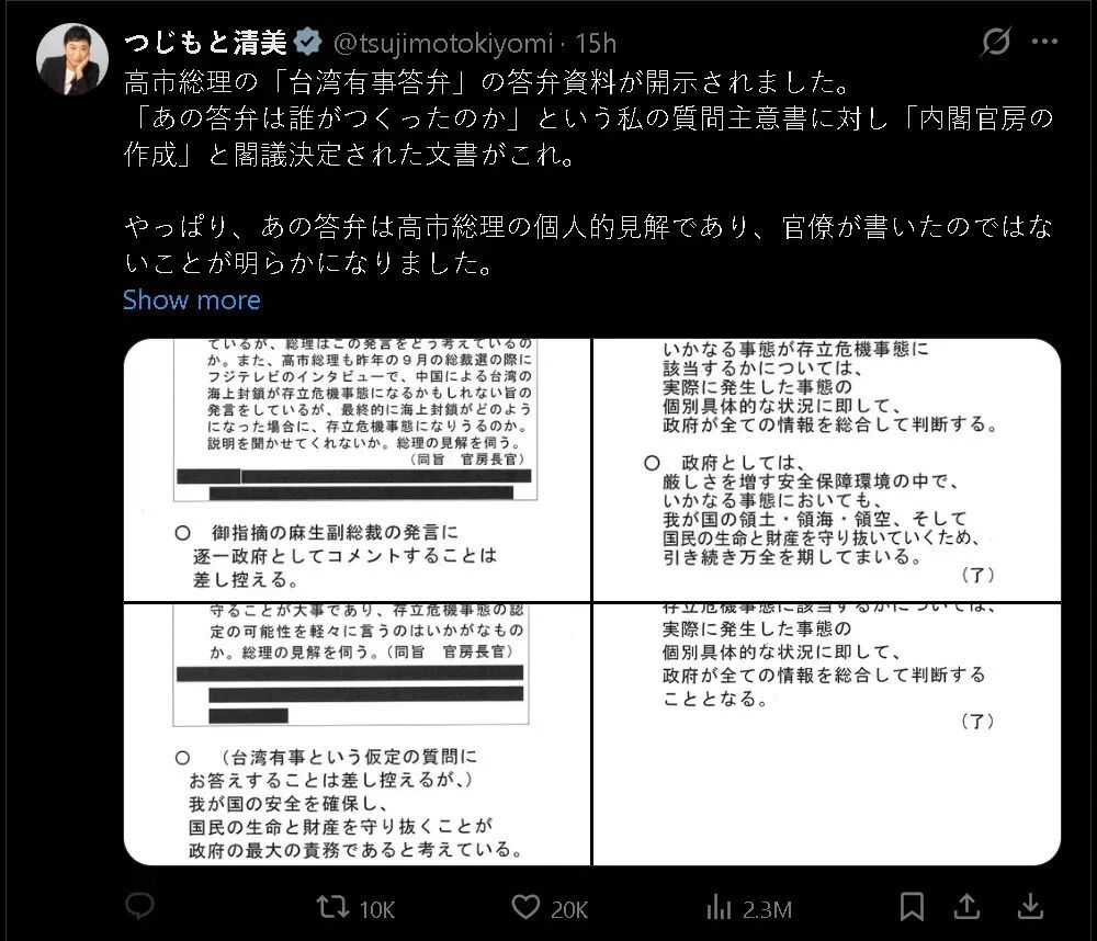 该媒体还披露,这份内阁秘书处为高市早苗准备的应答材料,是由日本立宪民主党籍左翼参议员辻元清美对外公布的。辻元清美在自己的社交账号上还披露了更多这份应答材料的详情。